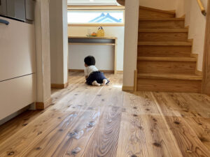 無垢材の床は、化学接着剤を使わず、自然の木そのものの温もりを感じられます。