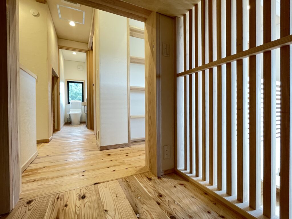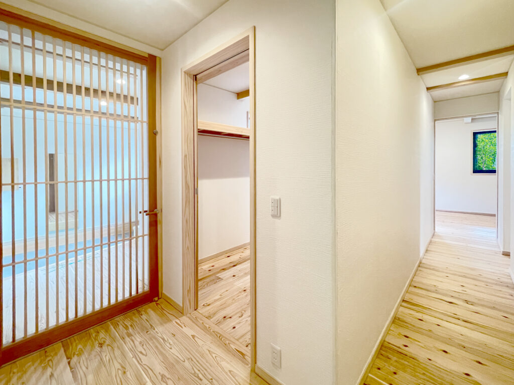 部屋の仕切りもオリジナルで格子扉を作成しました。少しでも解放感を感じる事ができる様にという施主様の想いが色々な個所に散りばめられています。