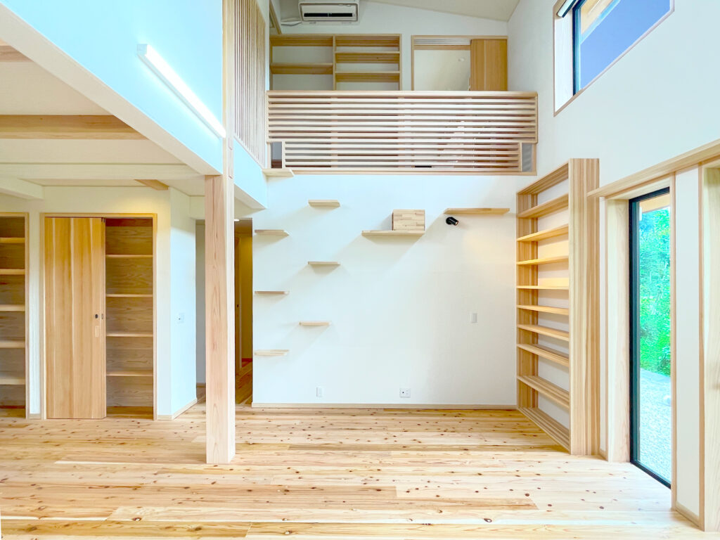 施主様のアイデアから作られたオリジナルのキャットウォークスペース。ネコちゃんが籠れるスペースも大工さんが手作りしてくれました。1階と2階を行き来できるよう両サイドに猫穴をつくりました(*^-^*)