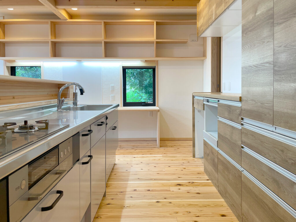 キッチン周りも収納がたくさん。壁際のカウンター周りも本が大好きな奥様やお子供達が勉強しやすいよう、マグネットウォールや天井の本棚などなど。自由設計ならではのぴったりスペースがいっぱいです♪